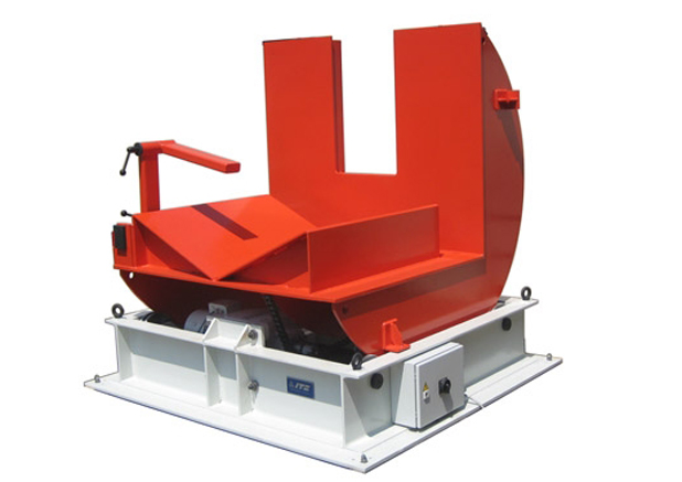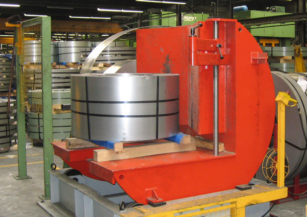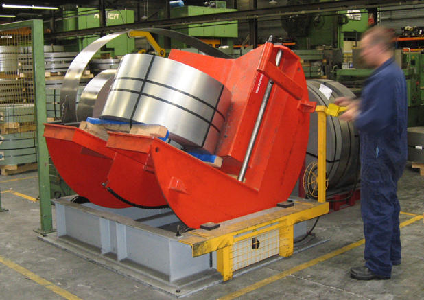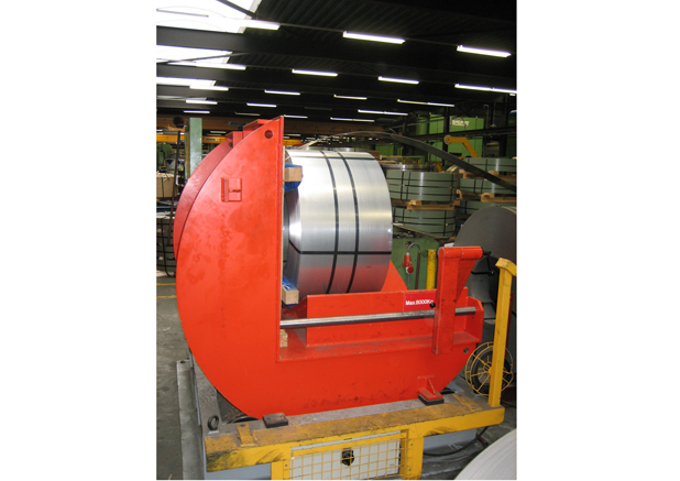 The upper part of the coil dump table has double bearings and is double geared. It is driven by a 3 phase motor. The table has a prism for coil centring and can be blocked on the side to prevent the coil from turning over. A double chain is mounted to prevent the system from turning by eventual chain breakage.